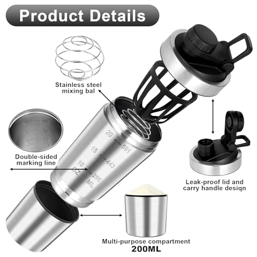 Design Deux en un : Shaker proteine en acier inoxydable a un design à deux couches et est amovible. la partie supérieure a une capacité de 600 ml et la partie inférieure une capacité de 200 ml, ce qui permet de stocker des protéines en poudre, du café en poudre et d’autres aliments, afin que vous puissiez faire le plein d’énergie à temps, même en déplacement