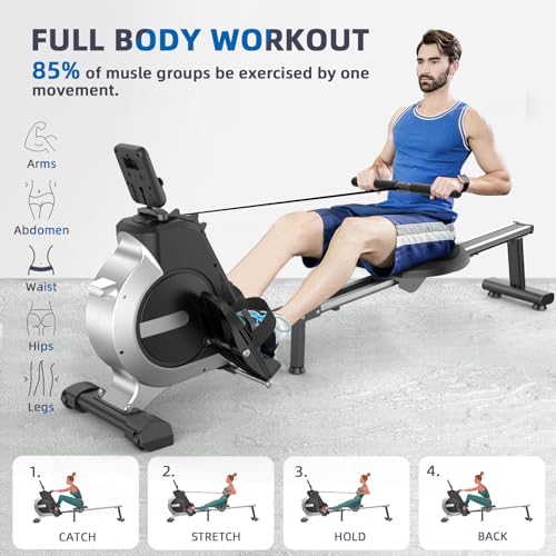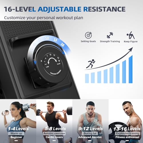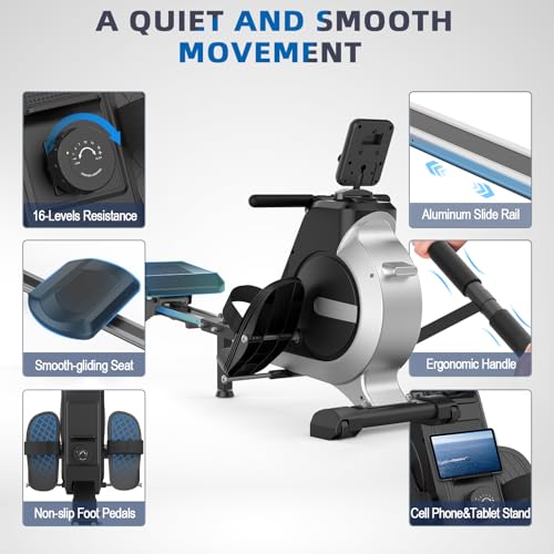 Rameur, Rameur Supersilencieux avec Résistance Magnétique à 16 Niveaux, Guide Coulissant en Aluminium, écran LCD, Repose-Pieds réglable et Support pour Tablette