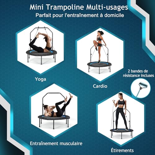 ﹟ 𝐌𝐮𝐥𝐭𝐢𝐟𝐨𝐧𝐜𝐭𝐢𝐨𝐧 𝐩𝐨𝐮𝐫 𝐃𝐢𝐟𝐟é𝐫𝐞𝐧𝐭𝐬 𝐄𝐱𝐞𝐫𝐜𝐢𝐜𝐞𝐬 ﹟ Avec la poignée et deux bandes de résistance, le trampoline vous offre la possibilité de pratiquer différentes activités d’entraînement comme le saut, le stretching et le yoga.