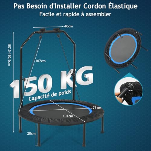 GYMAX Trampoline de Fitness φ101cm, pour Adultes & Enfants, Poignée en Mousses Réglable en Hauteur, Design Pliable, Toile de Bonne Résistance, Installation Facile