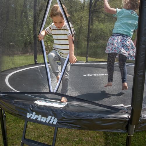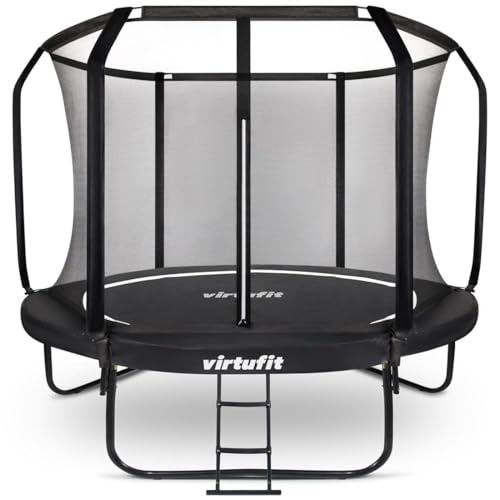 Le Trampoline VirtuFit Premium avec filet de sécurité offre le meilleur des meilleurs en matière d’expériences de saut. Cette variante premium du trampoline VirtuFit est non seulement solide et grande, mais est vraiment un surmatelas en termes de finition. Sauter pour les jeunes et les vieux Le saut de trampoline est amusant pour les enfants, mais certainement aussi pour les adultes. Le VirtuFit Premium Trampoline a un poids de charge de 150 kg. Avec le saut, vous pouvez vous amuser beaucoup tout en travaillant simultanément sur votre condition physique et votre combustion des calories. Trampoline au design moderne Le Virtufit Premium Trampoline est entièrement fabriqué en noir. Cela signifie que le cadre métallique, l’escalier et les tuyaux du filet de sécurité ont également été pulvérisés. Cela donne au trampoline un aspect moderne et élégant. Une pièce maîtresse dans votre jardin. Résistant à l’eau et aux UV Grâce à ses matériaux résistants à l’eau et aux UV, il n’y a aucun problème à garder ce trampoline à l’extérieur pendant de longues périodes. Qu’il pleuve, souffle ou ensoleillé, le trampoline premium résiste à toutes les conditions météorologiques. La base de ce trampoline est constituée de pièces de cadre en acier d’un diamètre de 38 mm et d’une épaisseur d’acier de 1,2 et 1,5 mm, ces pièces de cadre sont galvanisées, comme les ressorts. Les tubes sont en outre revêtus d’un revêtement en poudre noire. Toutes ces propriétés garantissent que le trampoline résiste à la rouille et à la corrosion. Trampoline avec filet de sécurité et bord de protection Le VirtuFit Premium Tampoline vous achètera un filet de sécurité avec fermeture éclair double face qui peut être ouvert des deux côtés. Grâce à sa construction en fibre de verre, le filet est étroitement tendu autour du plan de saut et empêche les chutes. La hauteur du filet est de 180 cm, ce qui lui assure également la sécurité en cas de sauts élevés. Pour éviter les blessures et les blessures sur le plan de saut, les ressorts métalliques sont recouverts d’un bord de protection résistant à l’usure qui assure un amorti supplémentaire en cas de chute ou de mauvais saut. Ce bord de sécurité de 26 cm de large.