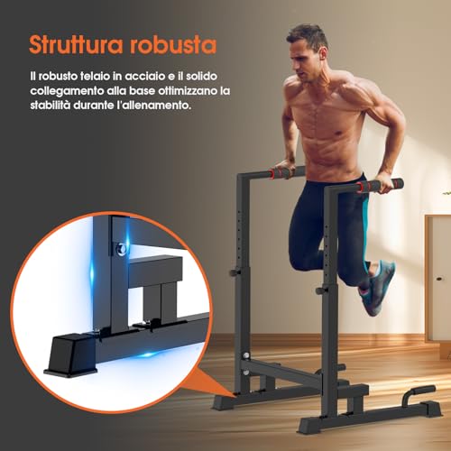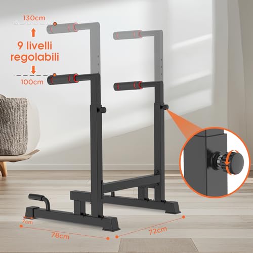 HAUTEUR RÉGLABLE INDIVIDUELLEMENT : Le support à dips réglable en hauteur sur 9 niveaux offre la possibilité d’ajuster la hauteur idéalement entre 100 et 130 cm pour s’adapter à différents exercices. Cela permet d’effectuer une grande variété d’exercices, y compris L-Sit, dips, pompes, Mountain Climbers, etc., afin de répondre aux besoins d’entraînement individuels.