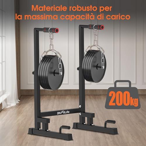 CHARGEMENT MAXIMAL : Le support à dips est fabriqué à partir de matériaux de haute qualité et peut supporter une charge dynamique maximale de 200 kg et une charge statique allant jusqu’à 500 kg. Les barres de connexion entre les deux supports assurent une stabilité maximale pendant votre entraînement.