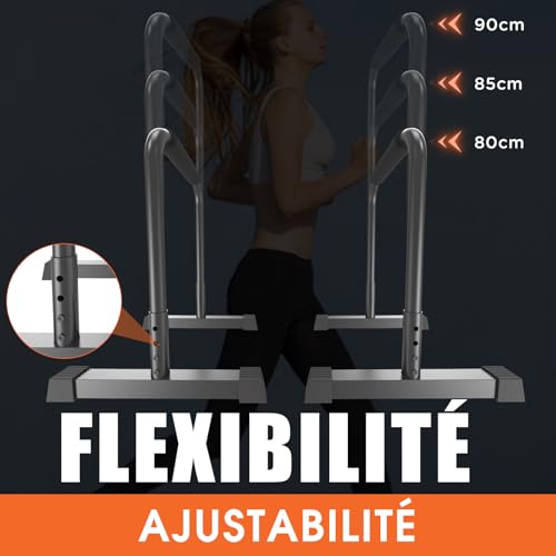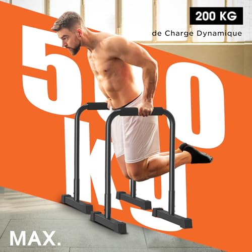 STABILITÉ MAXIMALE ET CAPACITÉ DE CHARGE : Fabriquées en acier allié de haute qualité, les barres de dips DH FitLife supportent des charges dynamiques allant jusqu’à 200 kg et des charges statiques jusqu’à 500 kg. Avec des pieds élargis de 52 cm et prolongés, ainsi que des embouts en caoutchouc antidérapants, elles offrent une sécurité et une stabilité exceptionnelles – idéales pour le calisthenics et divers exercices de renforcement musculaire.