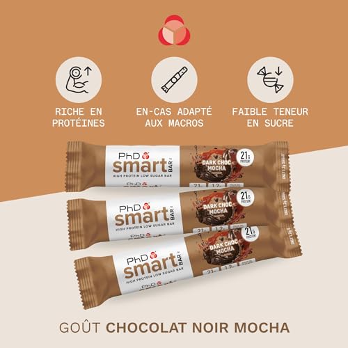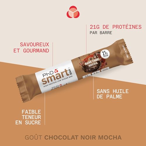 PhD Nutrition Smart Bar Barre protéinée 12x64g Chocolat noir et moka – En-cas High Protein avec 21g de protéines et peu de sucre, Barre protéinée macro-friendly