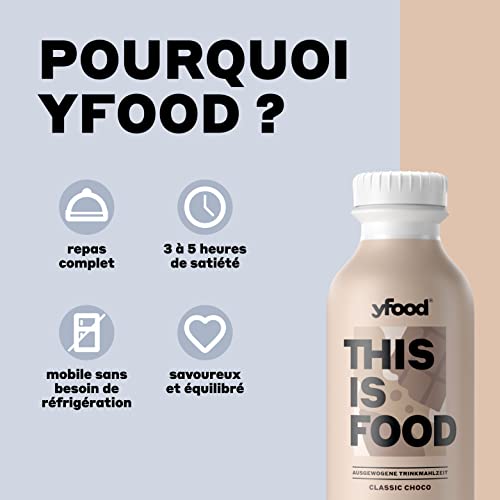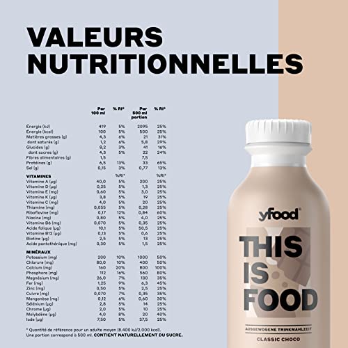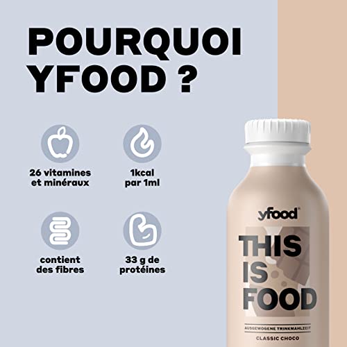 yfood Classic Choco, repas prêt à boire, THIS IS FOOD, substitut de repas, 33 g de protéines, 26 vitamines et minéraux (12 x 500 ml), goût chocolat