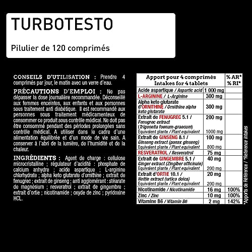 FORMULE NOUVELLE GÉNÉRATION – Fabriqué en France, Tubo Test contient des Acides Aminés et une synergie d’actifs à base de plantes : extrait de fenugrec ; extrait de ginseng ; stéarate de magnésium ; resvératrol ; extrait de gingembre et extrait d’ortie.