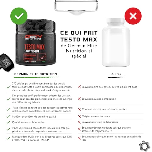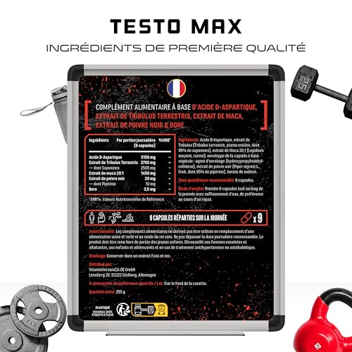 COMPOSITION INNOVANTE : Testo Max est un complément alimentaire purement végétal avec une formule spécialement combinée d’extraits de plantes, d’acides aminés et d’oligo-éléments. Chaque boîte contient 270 capsules végétaliennes. La formule innovante T-Boost combine de l’acide D-aspartique, de l’extrait de tribulus terrestris avec 95% de saponines, de l’extrait de maca 20:1, du poivre noir avec 95% de pipérine et du boron.