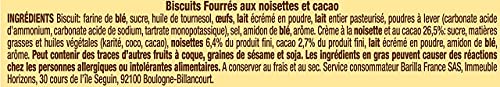 Biscuit : farine de BLÉ, sucre, huile de tournesol, OEUFS, LAIT écrémé en poudre, LAIT entier pasteurisé, poudres à lever (carbonate acide d’ammonium, carbonate acide de sodium, tartrate monopotassique), sel, amidon de BLÉ, arôme. Crème à la NOISETTE et au cacao 26,5%: sucre, matières grasses et huiles végétales (karité, coco, cacao), NOISETTES 6,4% du produit fini, cacao 2,7% du produit fini, LAIT écrémé en poudre, amidon de BLÉ, arôme. Peut contenir des traces d’autres FRUITS À COQUE, GRAINES DE SÉSAME et SOJA.