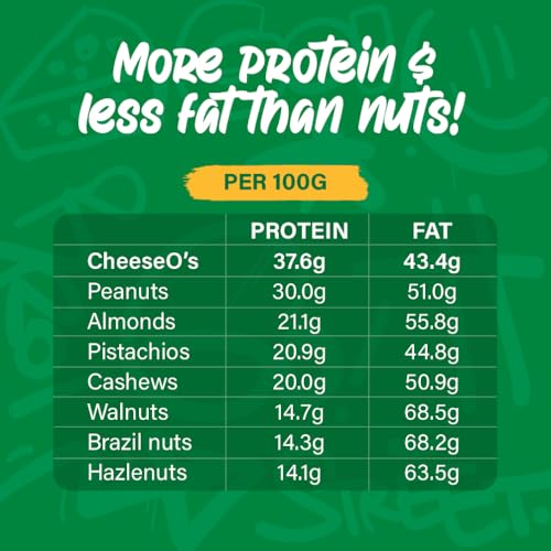 DE VRAIS AVANTAGES NUTRITIONNELS ! CheeseO’s est très riche en protéines et comme il est aussi pauvre en glucides, il est idéal pour les régimes cétogène (kéto), végétarien et sans gluten. Il est aussi riche en calcium et moins gras que les cacahuètes.