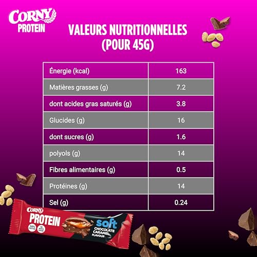 Avant ou après de faire du sport, entre les repas ou simplement à déguster à tout moment de la journée, cette barre vous offre un moment de plaisir dont vous avez besoin pour affronter vos défis quotidiens avec vitalité et surtout parce qu’elles sont délicieuse. Découvrez le plaisir de la barre protéinée Soft au chocolat au lait et caramel de Corny et laissez-la vous accompagner à chaque instant de votre journée ! De plus, étant sans sucres ajoutés, vous pouvez profiter du goût délicieux du chocolat au lait et du caramel. Chaque bouchée de cette barre vous plonge dans une expérience sensorielle unique, avec sa saveur onctueuse de caramel, et sa masse protéinée crémeuse, qui se combine parfaitement pour vous offrir un plaisir irrésistible à chaque bouchée. Emballées dans des boîtes de 12 unités de 45 g chacune, ces barres sont parfaites à emporter avec vous lors de vos déplacements, vous assurant d’avoir toujours un snack nutritif et délicieux à portée de main, que vous soyez à la salle de sport, au travail ou en déplacement.