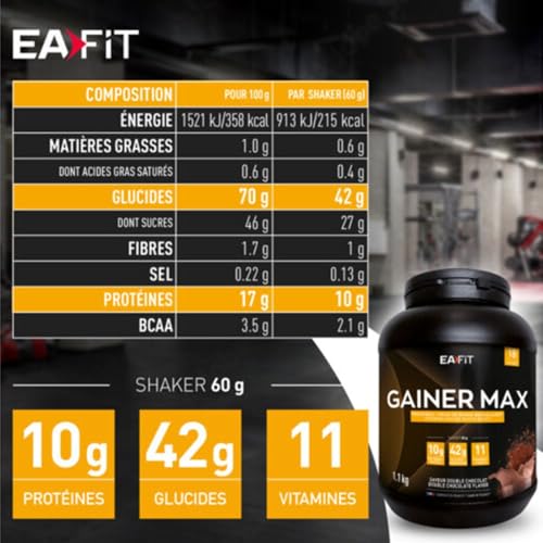 EAFIT | Gainer Max | Pour La Prise De Masse Musculaire Et L’Apport Calorique | 10g De Protéines + 42g De Glucides + 11 Vitamines Par Shaker | Double Chocolat 1,1kg