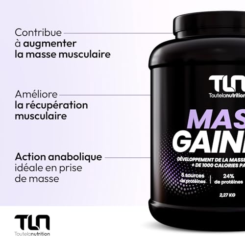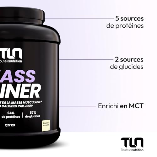MASS GAINER | Gainer Prise de Masse Musculation | +1500 kcal par jour | 5 Sources de Protéines + 2 Sources de Glucides + MCT | 22 Portions de Boisson Shaker Goût Vanille | 2,27 kg | TLN