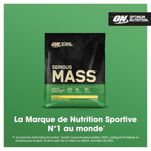Optimum Nutrition Serious Mass Poudre de Protéine Gain de Masse Hautement Calorique avec 25 Vitamines et Minéraux, Créatine Monohydrate et Glutamine, Saveur Banane, 16 Portions, 5.45 kg