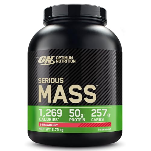 Optimum Nutrition Serious Mass Poudre de Protéine Gain de Masse Hautement Calorique avec 25 Vitamines et Minéraux, Créatine Monohydrate et Glutamine, Saveur Fraise, 8 Portions, 2.73 kg