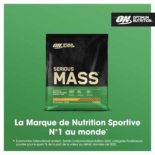 Optimum Nutrition Serious Mass Poudre de Protéine Gain de Masse Hautement Calorique avec 25 Vitamines et Minéraux, Créatine Monohydrate, Glutamine, Chocolat et Beurre de Cacahuète, 16 Portions, 5,45kg