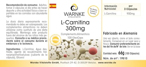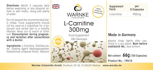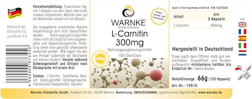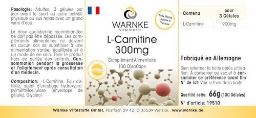 L-Carnitine 300mg – fortement dosé avec 900mg par dose journalière – 100Licaps – Carnipure liquide | Warnke Vitalstoffe – Qualité des pharmacies allemandes