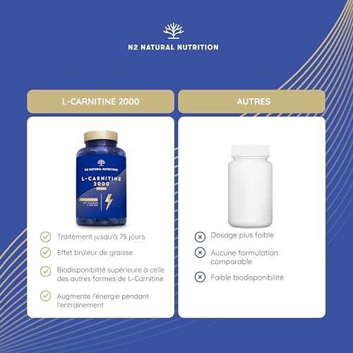 L-CARNITINE Naturelle 2000. 150 Capsules 75 jours. Haute Dose Extra Fort. Pre-Workout Sportives Energie Résistance et récupération. Haute Qualité et Concentration 2000 mg.UE.N2 Natural Nutrition