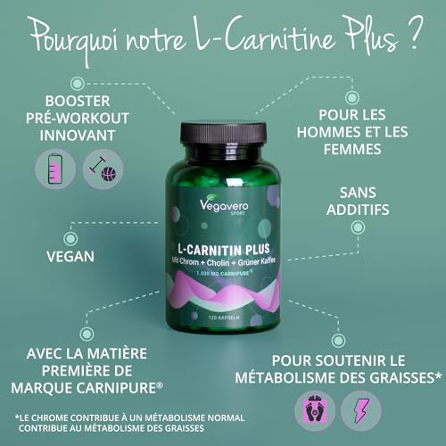 L-Carnitine PRO | Carnipure®, Café vert, Vitamines B, Chrome, Choline | PRE WORKOUT – Energie + Récupération | L Carnitine Tartrate EXTRA FORT | VEGAN | 120 Gélules | Vegavero®