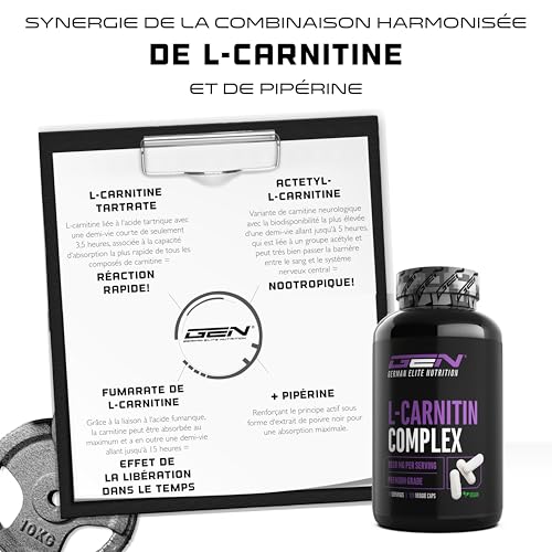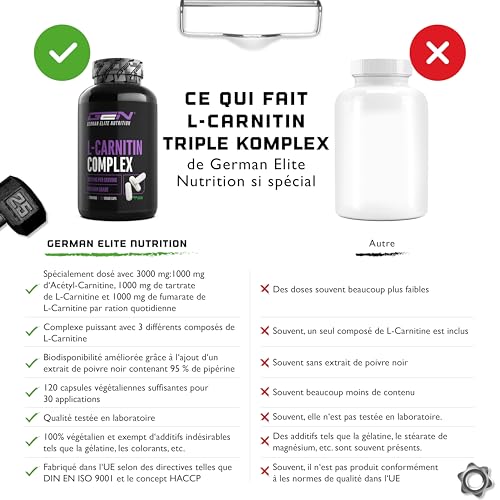 EXCELLENT PRIX PERFORMANCE : 120 capsules végétaliennes. Fortement dosé avec 3000 mg par dose quotidienne. Complexe de première qualité avec 3 composés de L-Carnitine et de l’extrait de poivre noir. Capsules extra-dosées de 750 mg (dont 250 mg d’acétyl-carnitine, 250 mg de tartrate de L-carnitine et 250 mg de fumarate de L-carnitine).