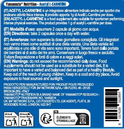 Yamamoto Nutrition Acétyl L-CARNITINE est un complément alimentaire avec 1000 mg d’ingrédient actif par gélule. Acétyl L-Carnitine (ALC) est la forme acétylée de la L-carnitine, qui a des propriétés légèrement différentes, et est l’une des formes les plus populaires de la carnitine. Pendant l’exercice, une grande partie de la L-Carnitine est convertie en ALC dans les mitochondries par l’enzyme Carnitine O-acétyltransférase. Acétyl L-CARNITINE est un complément alimentaire recommandé pour les adultes actifs, à base de Carnitine (de l’acétyl L-Carnitine), un porteur physiologique d’acides gras.