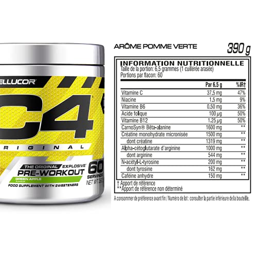 Poudre pré-entraînement C4 Original – pomme verte | Boisson énergisante pré-entraînement | 150 mg de caféine + bêta-alanine + monohydrate de créatine | 60 portions