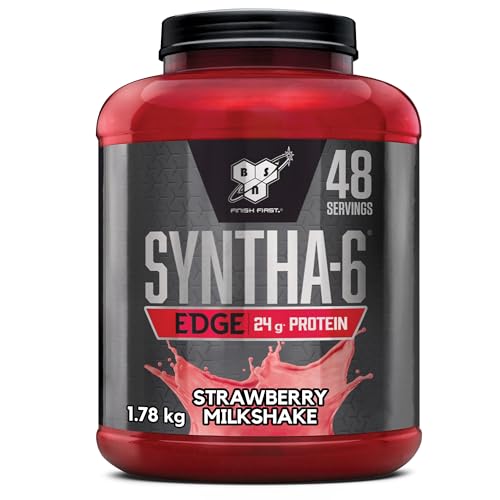 BSN Syntha 6 Edge poudre protéinée pauvre en glucides & sucre, avec isolat de protéines de lactosérum et BCAA, complément pour prise de masse musculaire, milkshake fraise, 48 doses, 1,78 kg