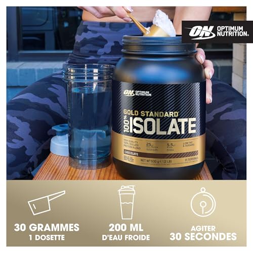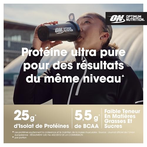Vous cherchez à augmenter votre apport en protéines? Choisissez la formule prouvée d’Optimum Nutrition, la ON Gold Standard 100% Isolate Whey Protéine en poudre et obtenez un maximum de résultats avec un minimum d’ingrédients. Avec l’isolat ON, vous pouvez atteindre vos objectifs de forme physique et une silhouette parfaite. L’isolat de protéines de lactosérum d’Optimum Nutrition favorise la croissance et le maintien de la masse musculaire et le maintien d’une ossature normale*. Cette poudre de haute qualité est une excellente source de protéines pour tous les athlètes bodybuilders et modèles de fitness. Notre poudre de protéines est ultra-filtrée pour une pureté exceptionnelle. Elle est créée à partir de protéines de lactosérum de la plus haute qualité, qui subissent une série de processus de filtration sophistiqués pour « isoler » l’excès de matières grasses et de glucides. Une partie de cet isolat est ensuite hydrolysé – décomposé en plus petites chaînes d’acides aminés. Le résultat est une poudre de protéines complètes à faible teneur en glucides, conçue pour pénétrer rapidement dans votre organisme afin que vos muscles puissent se reconstruire. Elle ne contient pas plus de 0,3 g de sucre, 0,4 g de graisse, et 83 % de protéines pures, plus 5,5 g d’acides aminés essentiels naturels – BCAA – par portion. Utilisez l’isolat de protéines de lactosérum Gold Standard d’Optimum Nutrition avant l’entraînement pour favoriser la croissance de la masse musculaire sèche*, après l’entraînement pour soutenir votre récupération ou à tout moment de la journée comme un délicieux shake protéiné. Cet isolat de protéines est disponible en trois saveurs très appréciées : chocolat, vanille et fraise. Pour créer des boissons protéinées parfaites, ajoutez 30 g (1 mesure arrondie) à 200 ml d’eau froide, mélangez et dégustez. *Source EFSA Journal 2010;8(10):1811 ; 2011;9(6):2203