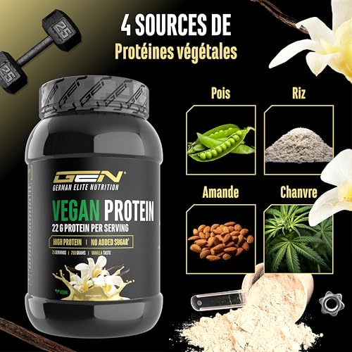 Poudre de protéine végétalienne – Protéines végétales de pois, riz, amande et chanvre – Sans soja – Délicieux & crémeux – (750 g, vanille)