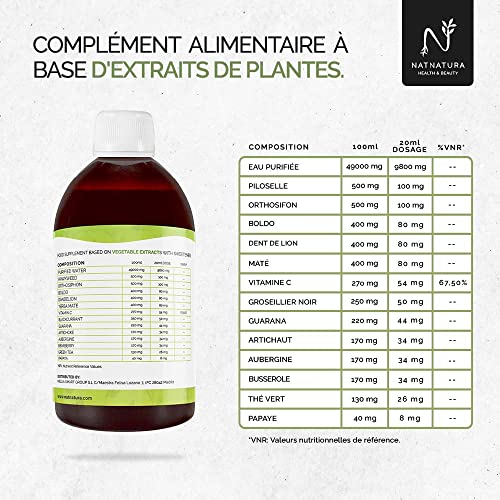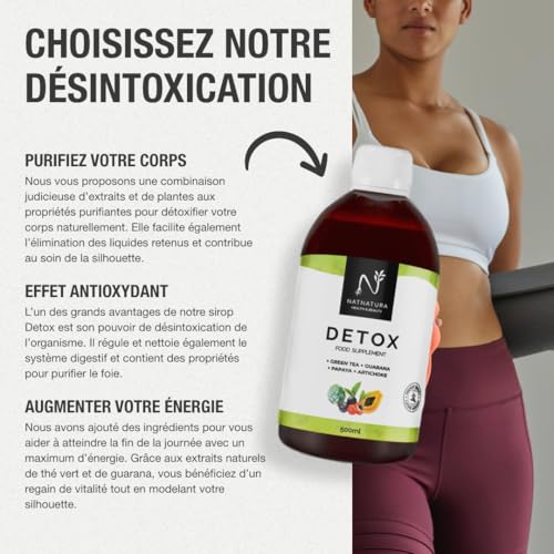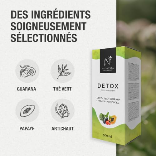 FORMULE DÉTOX AMINCISSANTE. Grâce à l’association d’ingrédients naturels de Détox sirop NATNATURA HEALTH & BEAUTY à base de Thé vert, Pissenlit, Guarana et Papaye, vous obtiendrez un effet amincissant et dépuratif en quelques jours. Son format sirop à mélanger à de l’eau permet une assimilation rapide et une action plus efficace sur l’organisme.