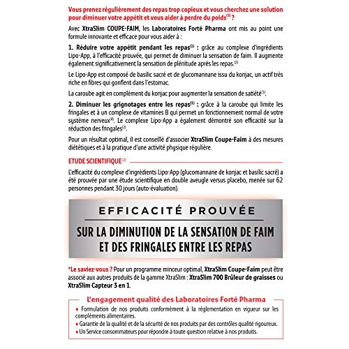 Avec XtraSlim COUPE-FAIM, les Laboratoires Forté Pharma ont mis au point une formule innovante et efficace pour vous aider à : 1. Réduire votre appétit pendant les repas(1) : grâce au complexe d’ingrédients Lipo-App, à l’efficacité prouvée, qui permet de diminuer la sensation de faim. Il augmente également significativement la sensation de plénitude après les repas.(2) Le Lipo-App est composé de basilic sacré et de glucomannane issu du konjac, un actif très riche en fibres qui gonflent dans l’estomac. La caroube agit en complément du konjac pour augmenter la sensation de satiété(1). 2. Diminuer les grignotages entre les repas(1) : grâce à la caroube qui limite les fringales et à un complexe de vitamines B qui permet un fonctionnement normal de votre système nerveux(4). Le complexe Lipo-App a également démontré son efficacité sur la réduction des fringales(2). Pour un résultat optimal, il est conseillé d’associer XtraSlim Coupe-Faim à des mesures diététiques et à la pratique d’une activité physique régulière. *L’efficacité du complexe d’ingrédients Lipo-App (glucomannane de konjac et basilic sacré) a été prouvée par une étude scientifique en double aveugle versus placebo, menée sur 62 personnes pendant 30 jours (auto-évaluation). (1) La caroube contribue à réduire l’appétit et les grignotages. La caroube contribue à augmenter la sensation de satiété et de plénitude. (2) Etude Ninapharm WS/NP 16-0659 en double aveugle versus placebo sur le complexe d’ingrédients Lipo-App, 62 sujets – 30 jours (auto-évaluation).