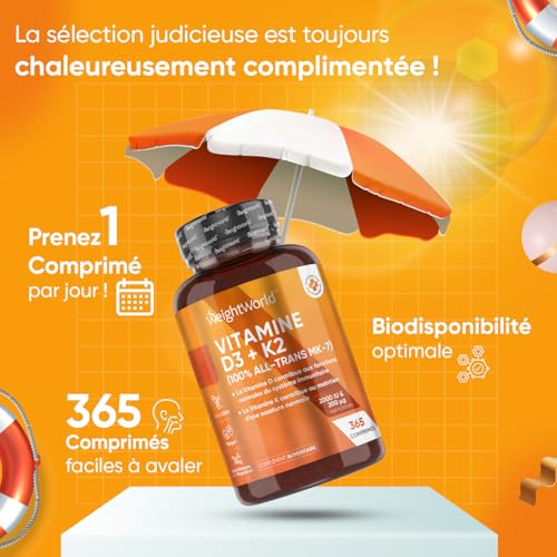 VITAMINE D 2000 UI, UN APPORT IDÉAL EN ÉTÉ ! La principale caractéristique de notre formule réside dans sa capacité à maintenir un niveau adéquat de vitamine D3 dans l’organisme. Avec 2000 UI de vitamine D3 et 200 μg de vitamine K2 par portion, nous utilisons des ingrédients de qualité pour vous offrir un stock de 365 comprimés pour une année entière (1 comprimé par jour).