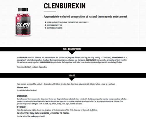 CLENBUREXIN est une composition spéciale d’ingrédients efficaces qui accélèrent la réduction de poids. Le produit a été développé pour aider le corps à maximiser la lutte contre le surpoids et l’excès de graisse corporelle. L’ensemble correctement sélectionné de vitamines et de substances thermogéniques naturelles avec un effet stimulant augmente le taux métabolique et la production de chaleur à partir des graisses, supprime l’appétit et agit de manière énergique. CLENBUREXIN favorise la combustion des graisses et la mise en forme du corps chez les personnes actives et sédentaires.