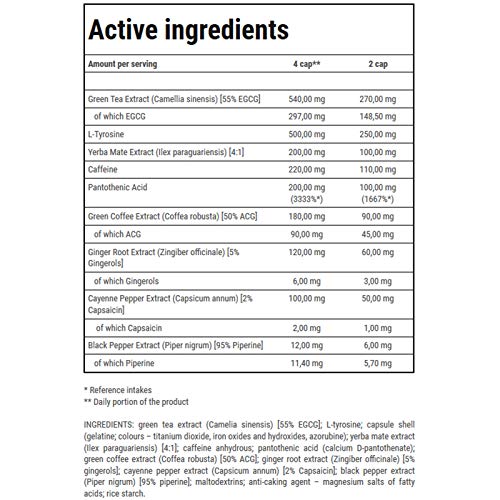 Extrait de thé vert, L-Tyrosine, extrait de Yerba Mate, caféine, acide panthothénique, extrait de café vert, extrait de racine de gingembre, extrait de piment de Cayenne, extrait de poivre noir