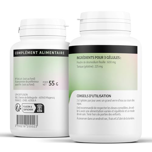 Liste des ingrédients pour 3 gélules : Desmodium feuille : 600 mg, Tunique (gélatine + glycérine) : 225 mg