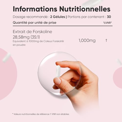 Forskoline 1000mg – Formulé à base de Coleus Forskohlii, il contient 60 gélules pour 30 jours d’approvisionnement, avec une dose de 1000mg de Forskoline par portion, équivalente à 28,6mg (35:1) d’extrait de Forskoline.