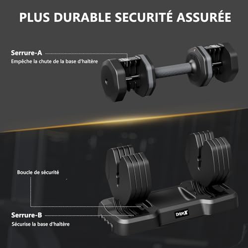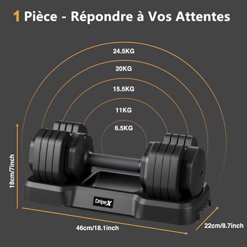 【5 en 1 Haltères Réglables】 Dripex Haltère réglable offrant 5 poids ajustables(6,5kg, 11kg, 15,5kg, 20kg et 24,5kg) pour tous vos exercices de musculation, et ce qui le rend adapté à tout le monde, des débutants aux amateurs de fitness avancés.