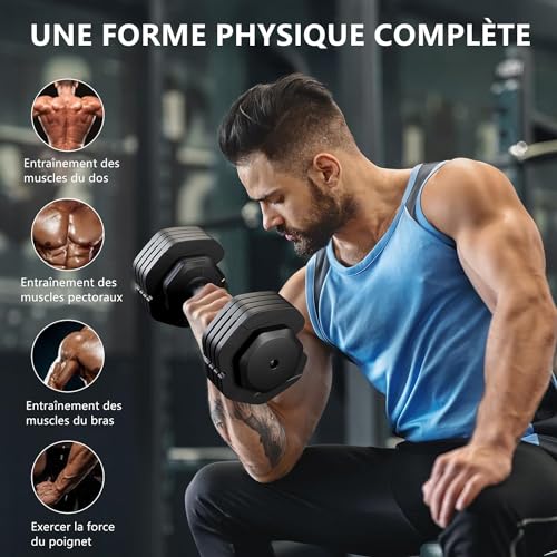 【Réglable en 1 Seconde】 Notre haltère musculation avec un réglage du poids en 1 seconde, il suffit de tournez simplement la poignée pour rajouter ou enlever du poids. Profitez d’un réglage plus rapide et plus fluide et gagnez en efficacité d’entraînement!