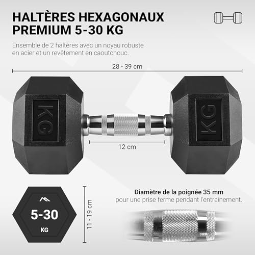 Lot d’haltères hexagonaux MSPORTS Premium (paire) | 5-30 kg | Revêtement antidérapant | Poignées chromées ergonomiques | Set d’haltères courts | Set d’haltères | Dumbell