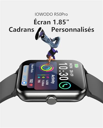 IOWODO Montre Connectée Femme Homme,Smartwatch, 100+ Modes Sports, Appel Bluetooth, Écran 1.85″, Cardiofréquence/Oxymètre/Analyse Sommeil, Montre Connectée pour Android/iOS (Noire)