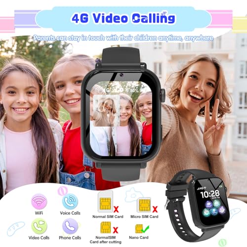 Montre Connectée Enfant 4G, Smartwatch Téléphone pour Filles Garçons avec GPS, SOS, WiFi, Appel Vidéo, Chat, Mode Classe Notification Jeux Réveil, Montre Intelligente Enfants Cadeau 4 à 12 Ans, Noir