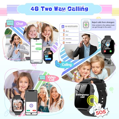 4G Calling/Chat/Video: Smoother communication: The latest watch Stable signal, clear and smooth call, support voice chat, and phone function. Equipped with front camera, supports HD two-way video call, parents can connect with their children at any time through mobile phone APP video, SOS one-key call for help function, rapid response to emergencies