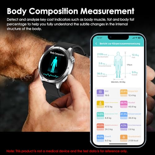 ✔IMC/30s Fonction de l’examen physique microscopique:Cette montre intelligente mesure la composition corporelle, recueille rapidement des données corporelles en 15 secondes, reçoit des rapports analytiques et comprend instantanément le pourcentage de graisse corporelle pour des activités de santé ciblées. Cette montre ECG offre également une surveillance corporelle simple. En un seul clic, votre fréquence cardiaque, votre tension artérielle, votre oxygène sanguin, votre pression et votre température corporelle peuvent être mesurés en seulement 30 secondes.