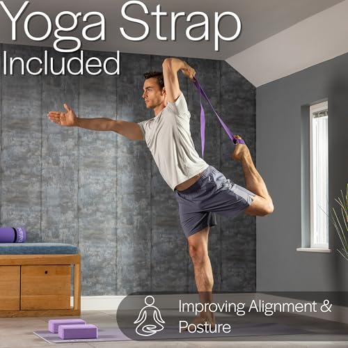 Lot 2 Blocs de Yoga + 1 Sangle – Brique Confort, Robuste, Légère en Mousse EVA Haute Densité pour Stretching, Fitness, Pilates – Ceinture Coton avec Boucle de Serrage D, 5 Couleurs